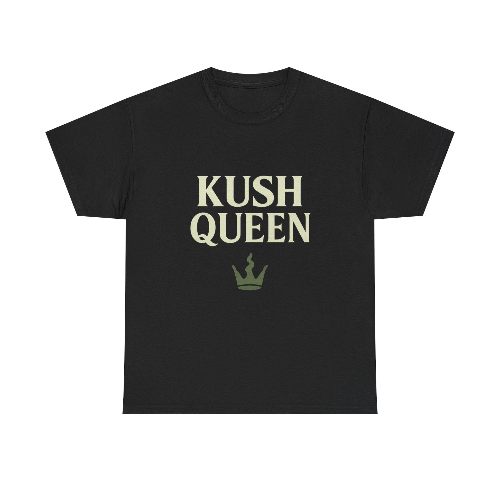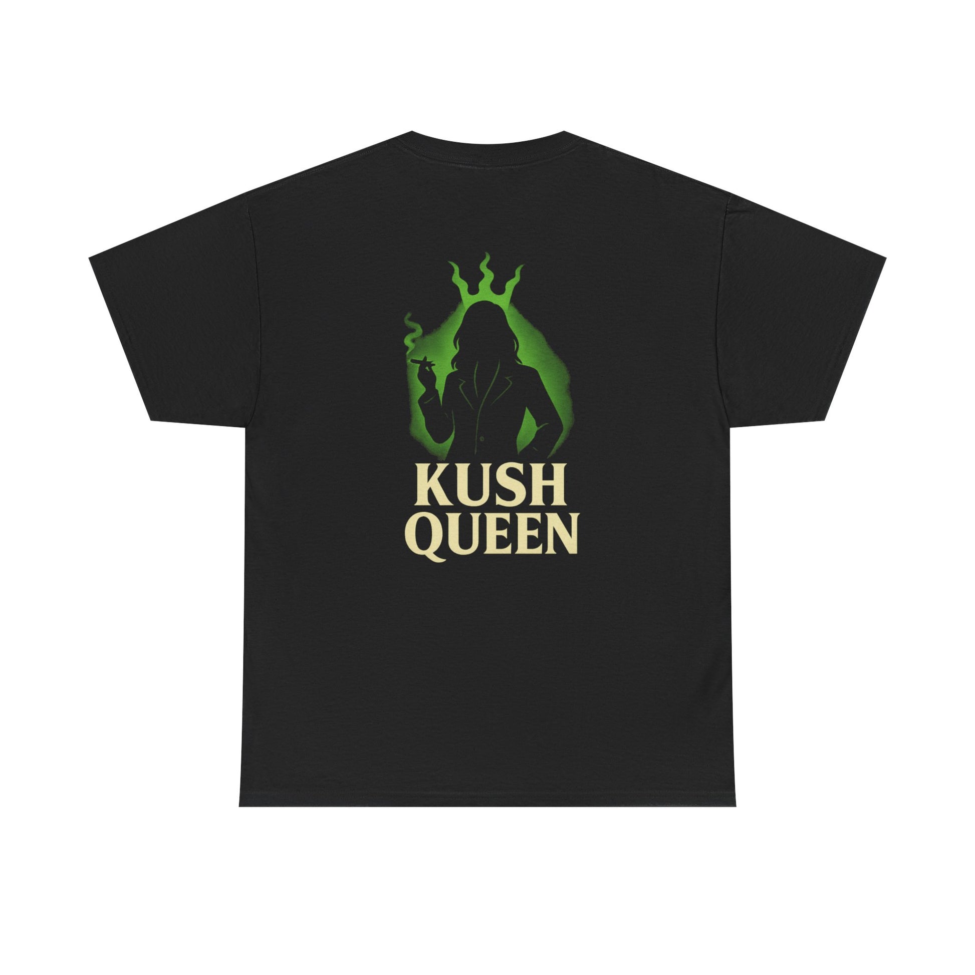 Kush Queen puts the crown on your fit. Clean cream serif type over jet-black cotton with a smoked-green mini crown on the chest; a glow-green queen silhouette anchors the back. Royal, low-key, and built to match everything.